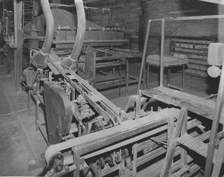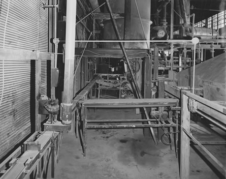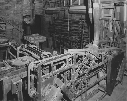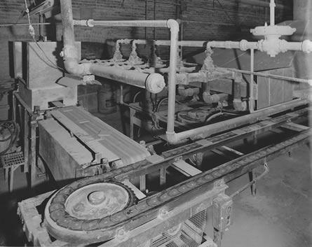 ![]() 8. Conveyor used to turn tiles over. Note tiles on top belt are upside down (as they come from press). Tiles on lower belt are right side up. |