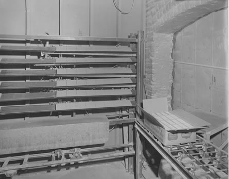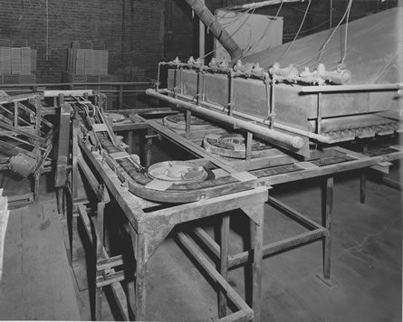 ![]() 11. Glazed tiles emerging from spray machine. Note tiles "spread out" automatically and are rotated 90 degrees. |